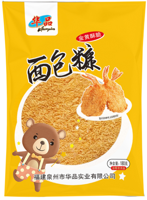 規格:180克*32包配料:小麥粉、食用淀粉、飲用水、食用鹽、食品添加劑(單,雙甘油脂肪酸酯、碳酸鈣、檸檬黃、日落黃)食用方法:1、調味:把洗干凈的食物瀝干水后裹上一層薄薄的面粉并依個人口味灑上食鹽、胡椒粉及其它調味料。 2、上漿:將食物全身浸入調勻的雞蛋液里(面粉和雞蛋的混合物) 3、包裹:將上漿的食物,用華品牌面包糠均勻的包裹好,放置2-3分鐘備用。 4、油炸:將油加熱至175℃-180℃,把備用的食物放入油鍋,翻動食物,炸至呈金黃色即可撈出